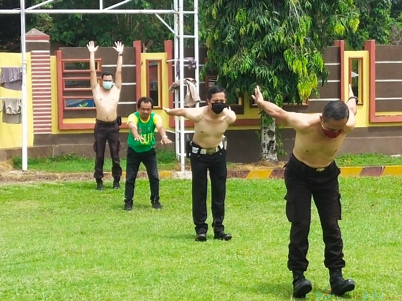 Anggota satuan Polres Barito Timur diwajibkan rutin setiap jam 10 pagi berjemur diri , dengan di berangin gerakan olah raga oleh anggota tersebut bersama insan Pers hari Rabu 8 April 2020 di halaman Mapolres Barito Timut .