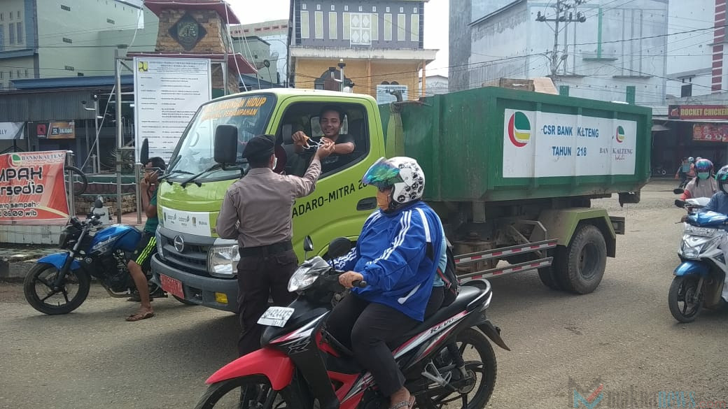 Di jalan tersebut tampak aparat anggota Polsek Dusun Tengah, Bartim menyapa warga yang sedang berkendera. Masker gratis membuat masyarakat yang melintas wilayah tersebut gembira.