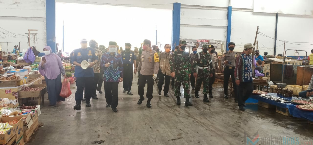 Barabai – Bupati Hulu Sungai Tengah, H. A. Chairansyah, Dandim 1002/ Barabai, Letkol Inf Muh Ishak H. Baharudin, dan Kapolres HST, AKBP Danang Widaryanto meninjau langsung kawasan wajib masker di pasar Karamat Barabai, Kamis (28/5). Pemantauan ini dilakukan guna mencegah penyeberan Covid-19 di HST.