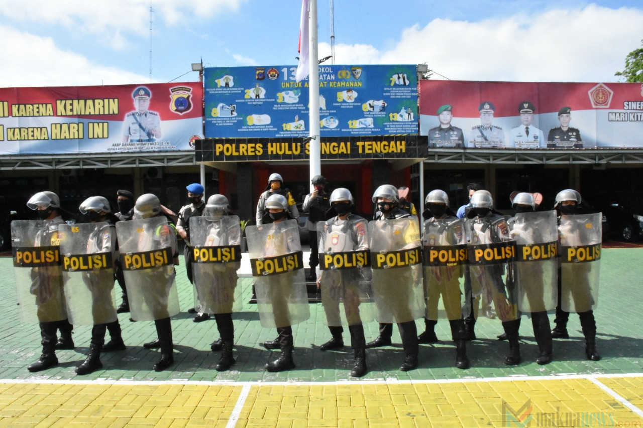 Latihan tersebut dipimpin oleh Kapolres HST, AKBP Danang Widaryanto dengan menggunakan metode simulasi kejadian, latihan diawali dengan bunyi alarm stelling sebagai tanda untuk berkumpul dan menempati plotting titik-titik pengamanan menggunakan perlengkapan perlindungan diri.