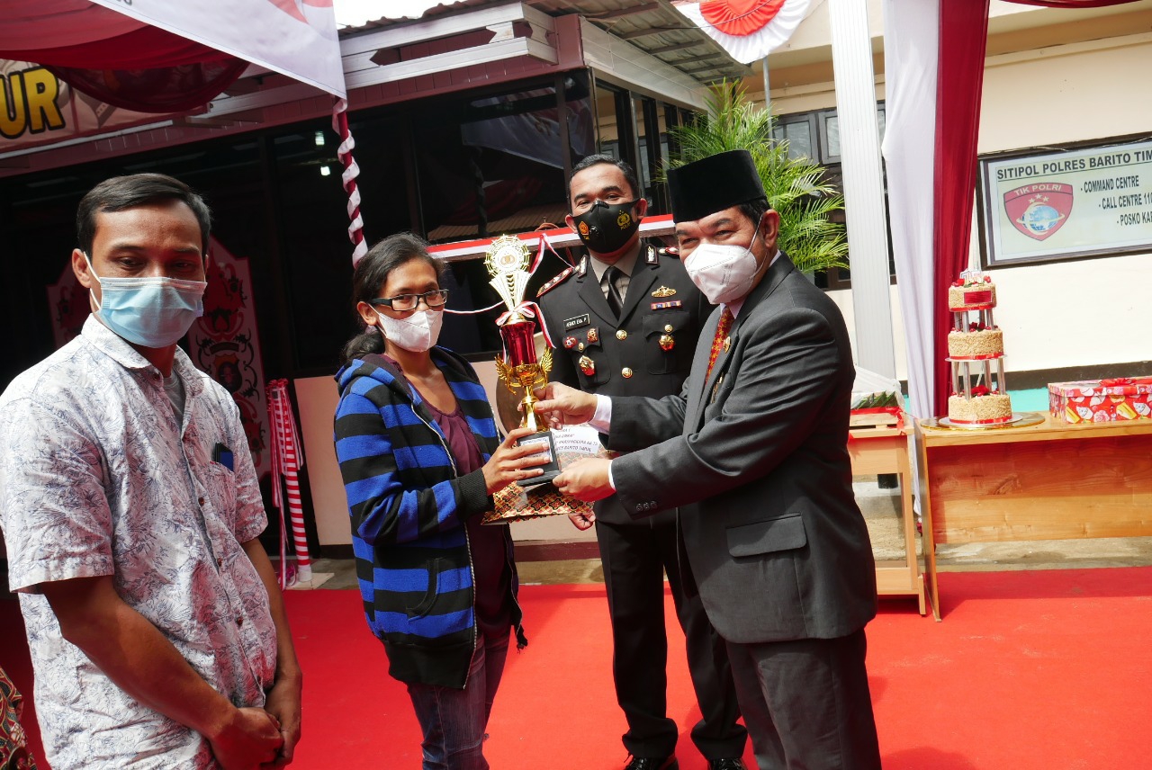 Sementara itu, pada syukuran Hari Bhayangkara Ke-75 ini, Polres Barito Timur memberikan bingkisan kepada Purnawirawan Polri, hadiah dan penghargaan kepada Juara Lomba PPKM, serta penyerahan piagam kepada siswa peserta Lomba Melukis. Acara ini ditutup dengan pemotongan nasi tumpeng oleh Kapolres Bartim AKBP Afandi Eka Putra bersama Bupati Ampera dan jajaran Forkopimda Bartim.