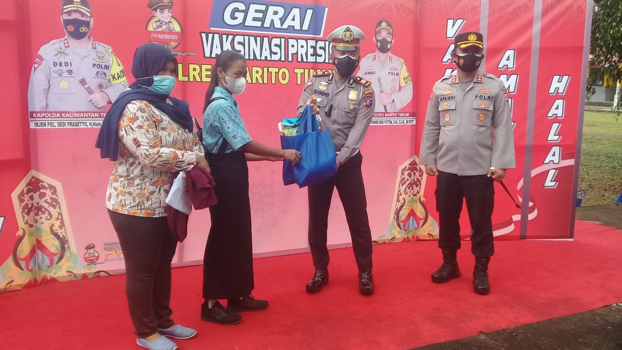 Usai kegiatan vaksinasi yang digelar Polres Bartim bersama Dinas Kesehatan dan Puskesmas Tamiang Layang pada Kamis (2/9/2021), jajaran Polres Bartim memberikan bingkisan kepada para vaksinator yang telah menyesaikan tugasnya. Bingkisan serupa juga diberikan kepada beberapa siswa yang ikut vaksinasi.