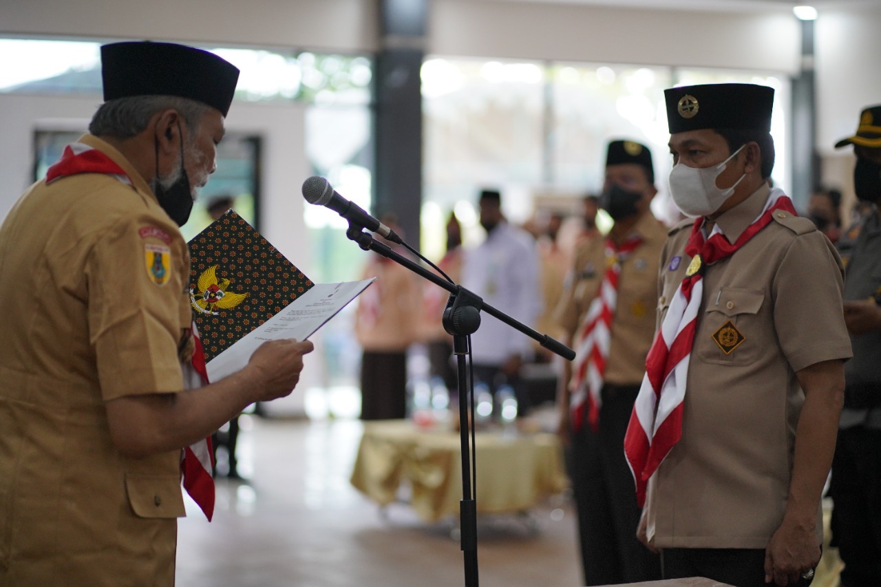 PARINGIN – Bupati Balangan Abdul Hadi resmi dilantik sebagai ketua majelis pembimbing cabang (Mabicab) Gerakan Pramuka Balangan, oleh Wakil Ketua Kwarda Gerakan Pramuka Kalimantan Selatan Karyono Ibnu Ahmad, masa bakti 2021-2026, di Aula Mayang Maurai, Senin (17/01/2022).