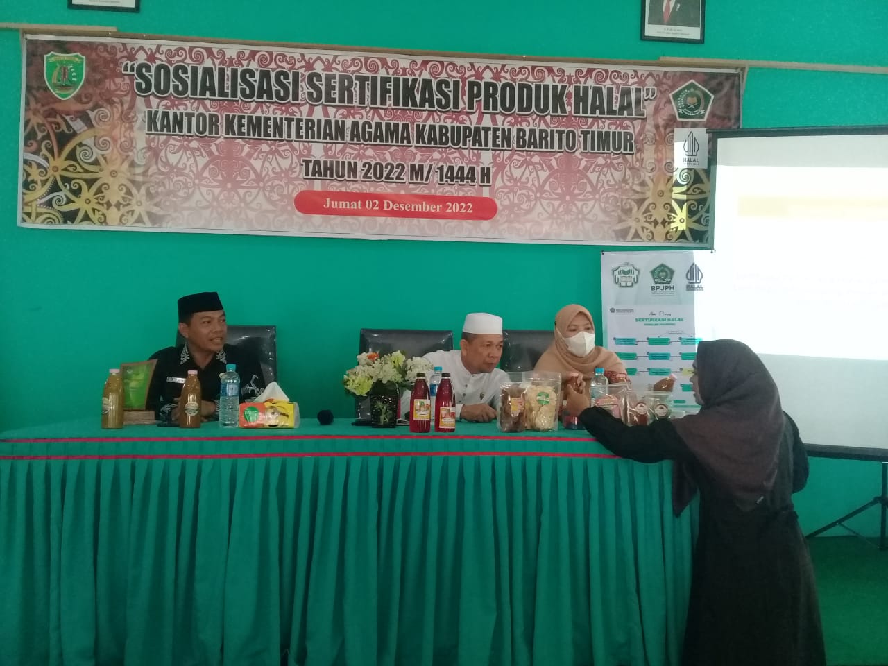 TAMIYANGLAYANG – Kantor Wilayah (Kalwil) Kementerian Agama (Kemenag) Provinsi Kalimantan Tengah (Kalteng) mensosialisasikan Sertifikasi Produk Halal kepada para palaku usaha Mikro binaan Dinas Perdagangan Koperasi dan UKM Kabupaten Barito Timur (Bartim), Jum’at (2/12/2022).