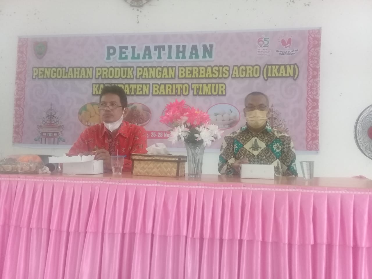 Pelatihan pengolahan produk pangan berbasis agro (ikan) yang dilaksanakan di Aula Kantor Dinstranaker Bartim ini dihadiri oleh Plt Kepala Dinstranaker Bartim Drs Tius Sulle Bani MAP.