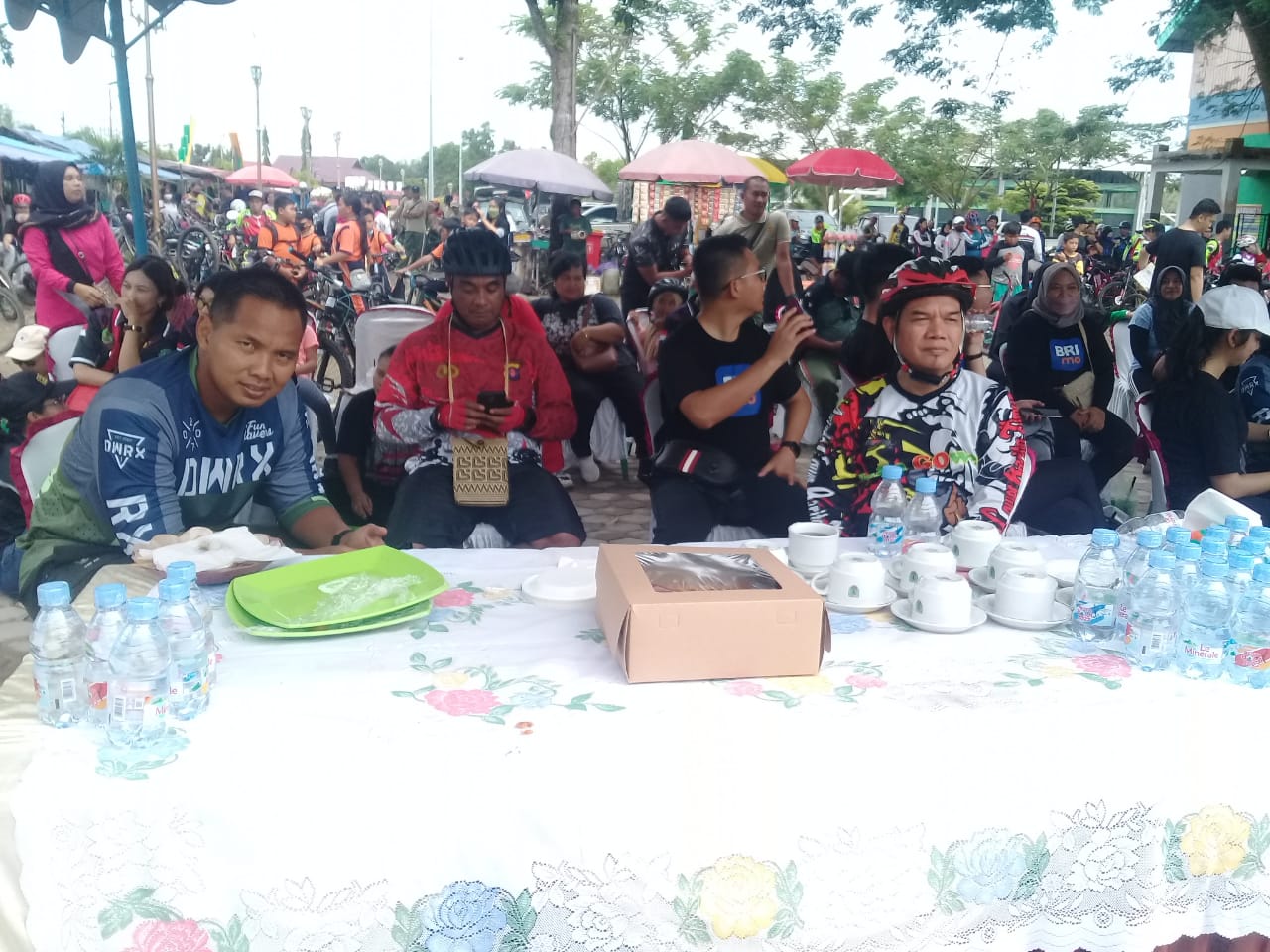 “Setelah bersepeda ria, keringat bercucuran, maka badan pun terasa bugar,” kata Bupati Ampera sembari menikmati apam barenda produk salah satu UMKM.