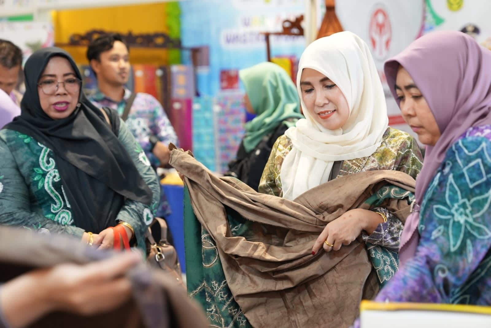 Ketua Dekranasda Kabupaten Balangan, Hj Sri Huriyati Hadi turut hadir dan mengunjungi stand-stand sasirangan yang dipamerkan masing-masing kabupaten/kota.