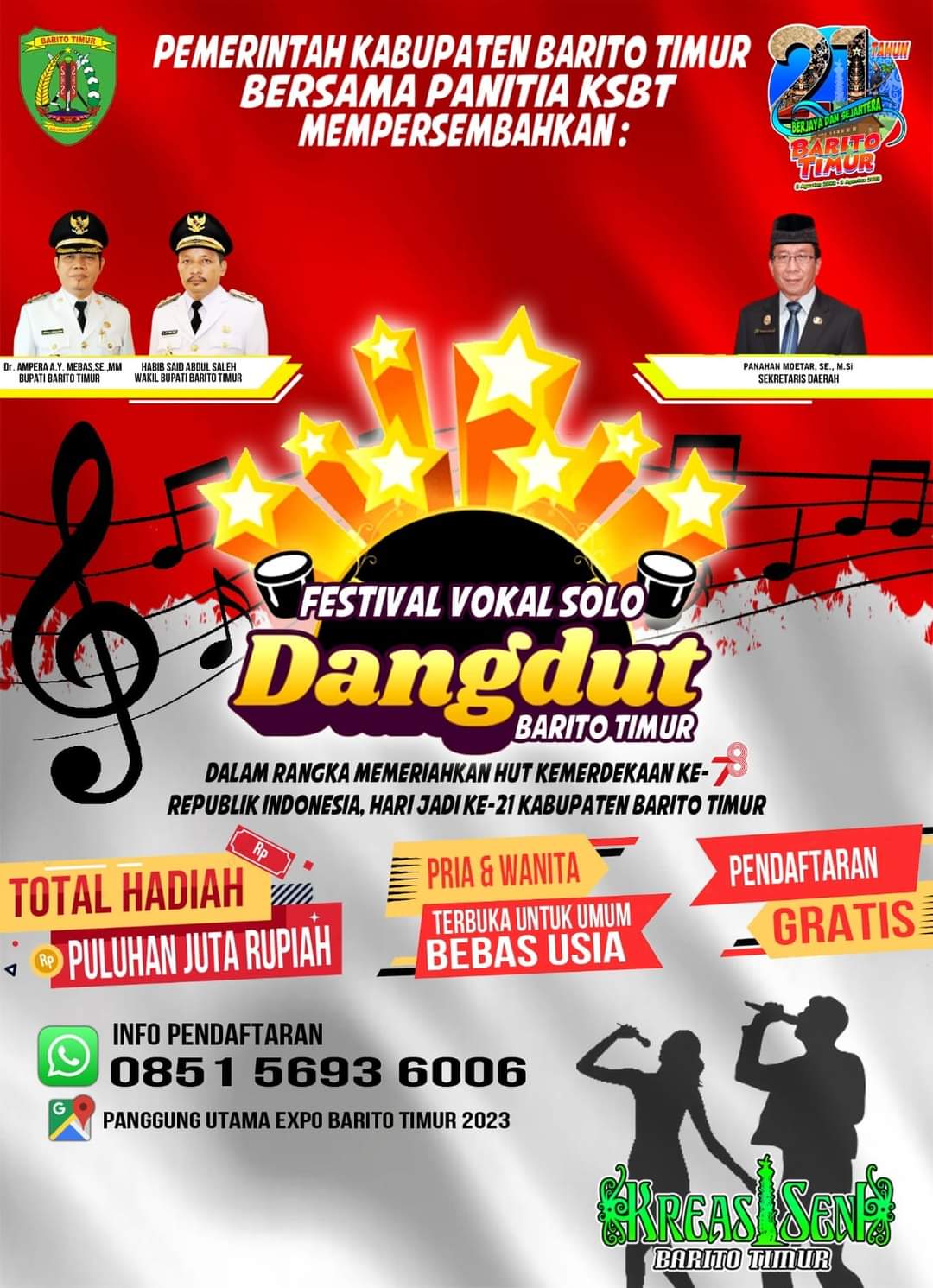 TAMIYANGLAYANG – Dalam rangka memeriahkan HUT RI Ke-78 dan Hari Jadi Barito Timur (Bartim) Ke-21, Pemerintah Kabupaten Bartim bersama Kreasi Seni Barito Timur (KSBT), menggelar Festival Solo Dangdut.