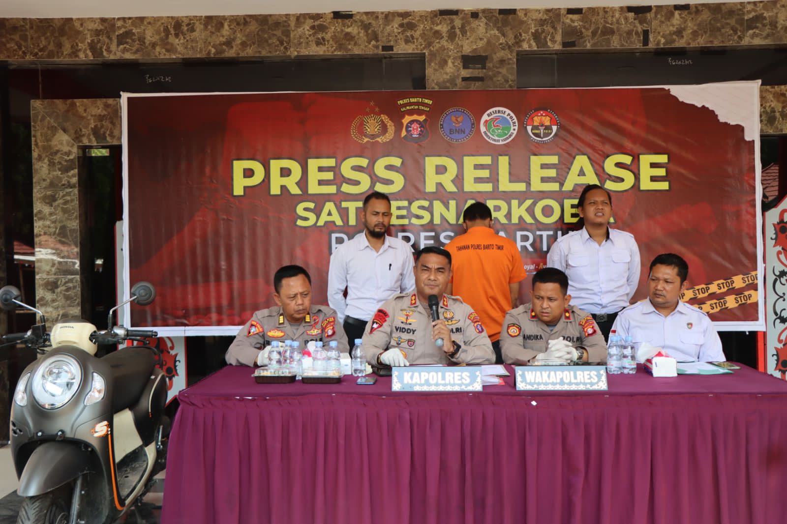 Dalam pers rilis pengungkapan kasus Narkotika ini, Kapolres Bartim AKBP Viddy Dasmasela didampingi Wakapolres Bartim Kompol Andhika Rama, Kabag Ops dan Kasat Narkoba.[]