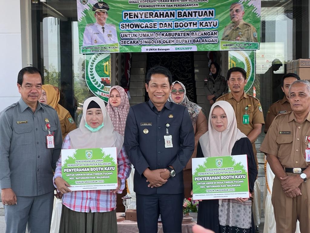 PARINGIN – Pemerintah Kabupaten Balangan serahkan bantuan berupa lemari pendingin atau showcase dan booth kayu, untuk pelaku Usaha Mikro Kecil Menengah (UMKM), di halaman Kantor Bupati Balangan, Paringin Selatan, Senin (28/8/2023).