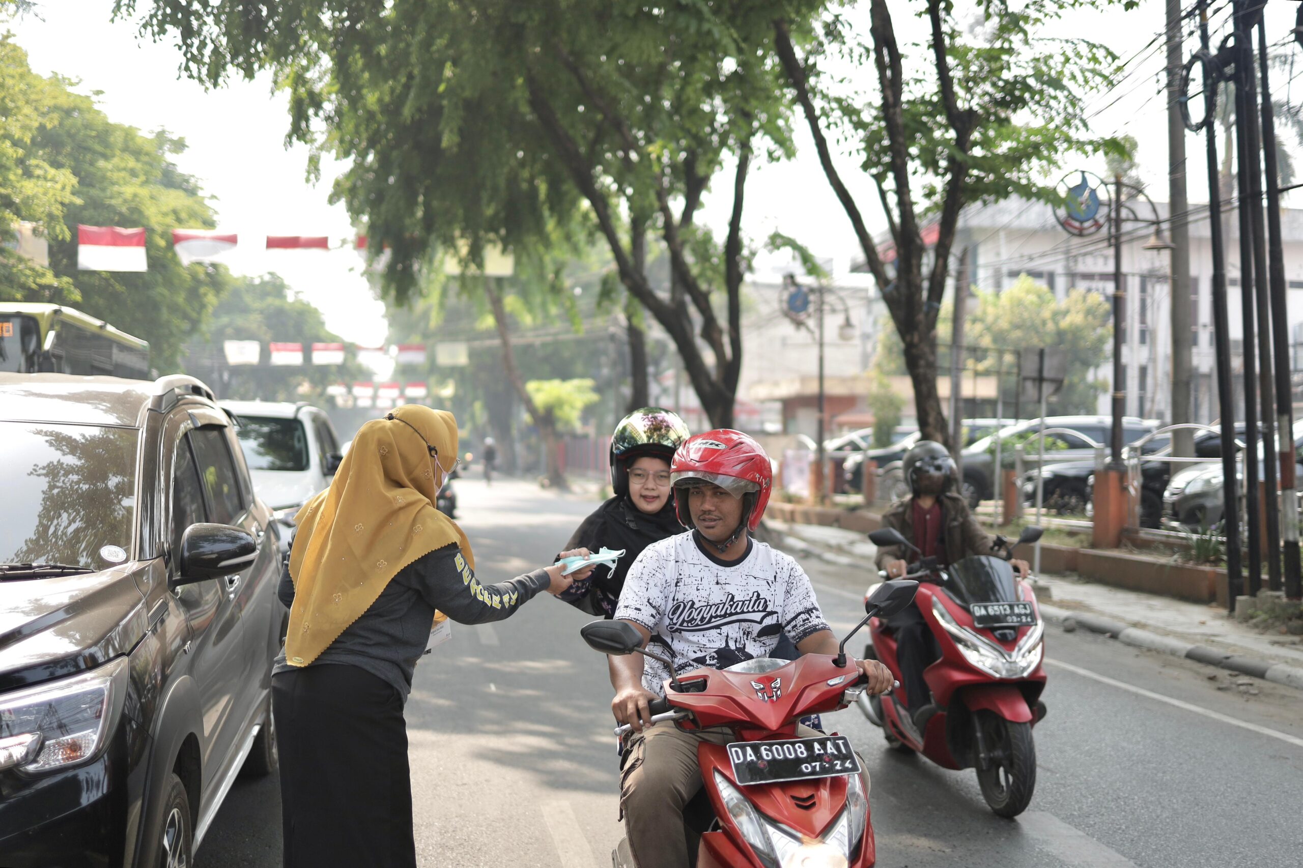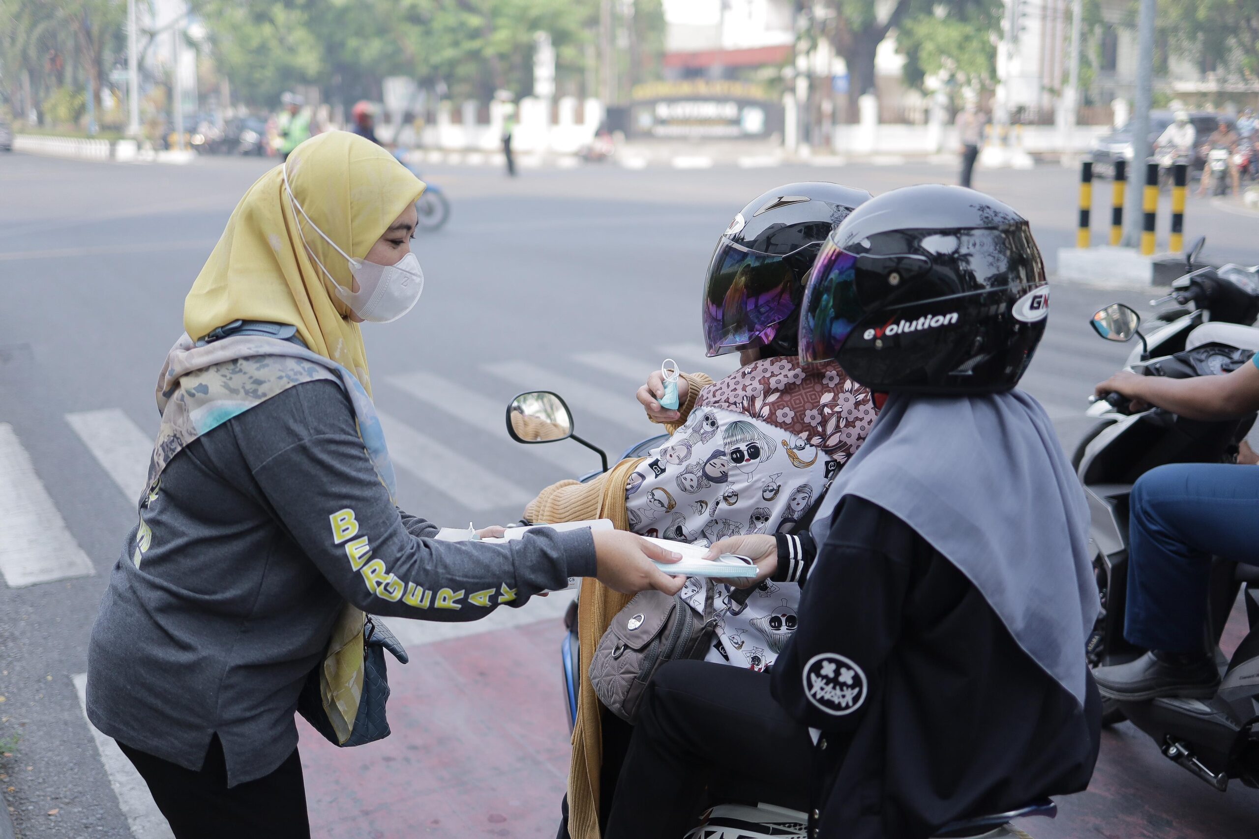 BANJARMASIN – Sekretariat DPRD Kalsel membagikan masker gratis kepada pengguna jalan di simpang empat lampu merah Kantor Pos, Jalan Lambung Mangkurat Banjarmasin, Senin (2/10/2023) pagi.