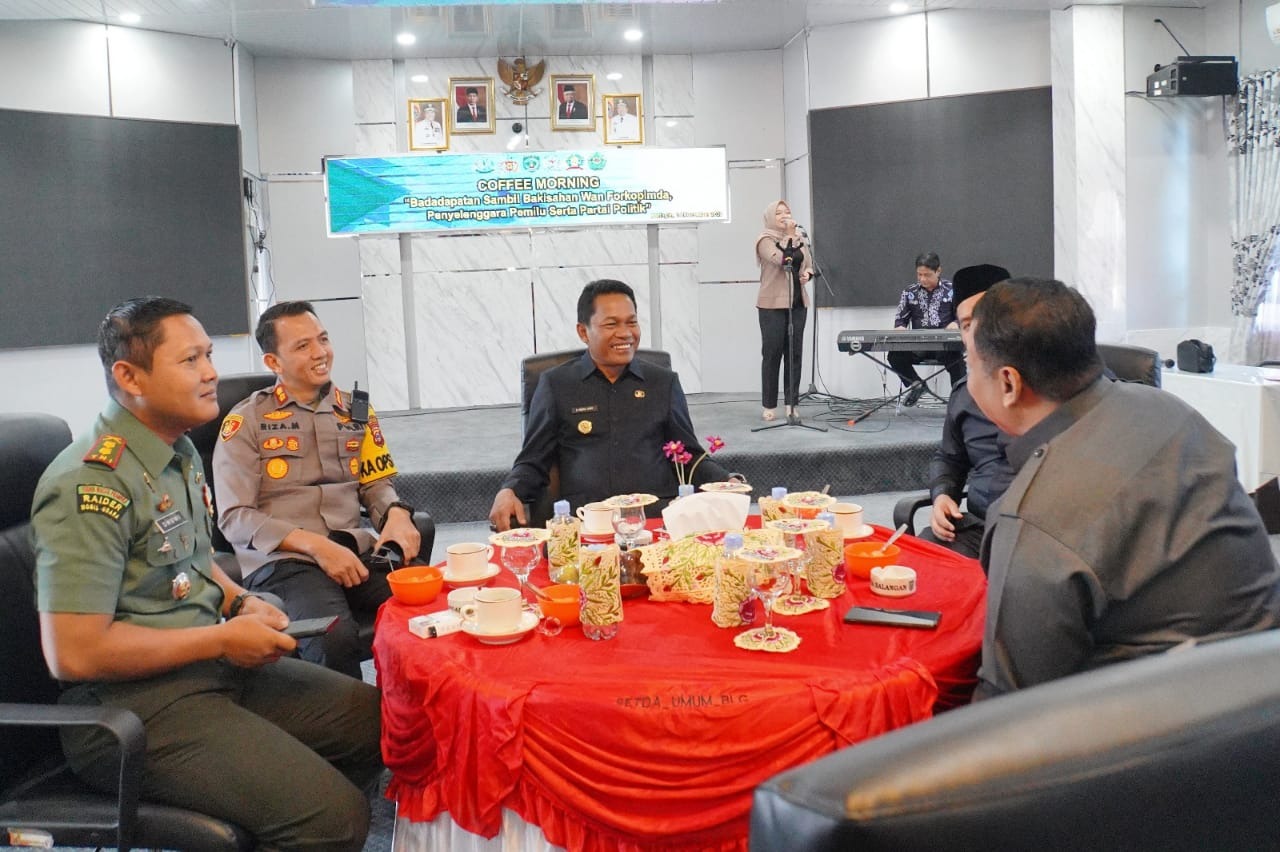 PARINGIN – Bupati Balangan Abdul Hadi hadiri Coffee Morning bersama Forkopimda Balangan, penyelenggara pemilu serta partai politik, di Aula Benteng Tundakan, Kantor Bupati Balangan, Paringin Selatan, Selasa (14/11/2023).