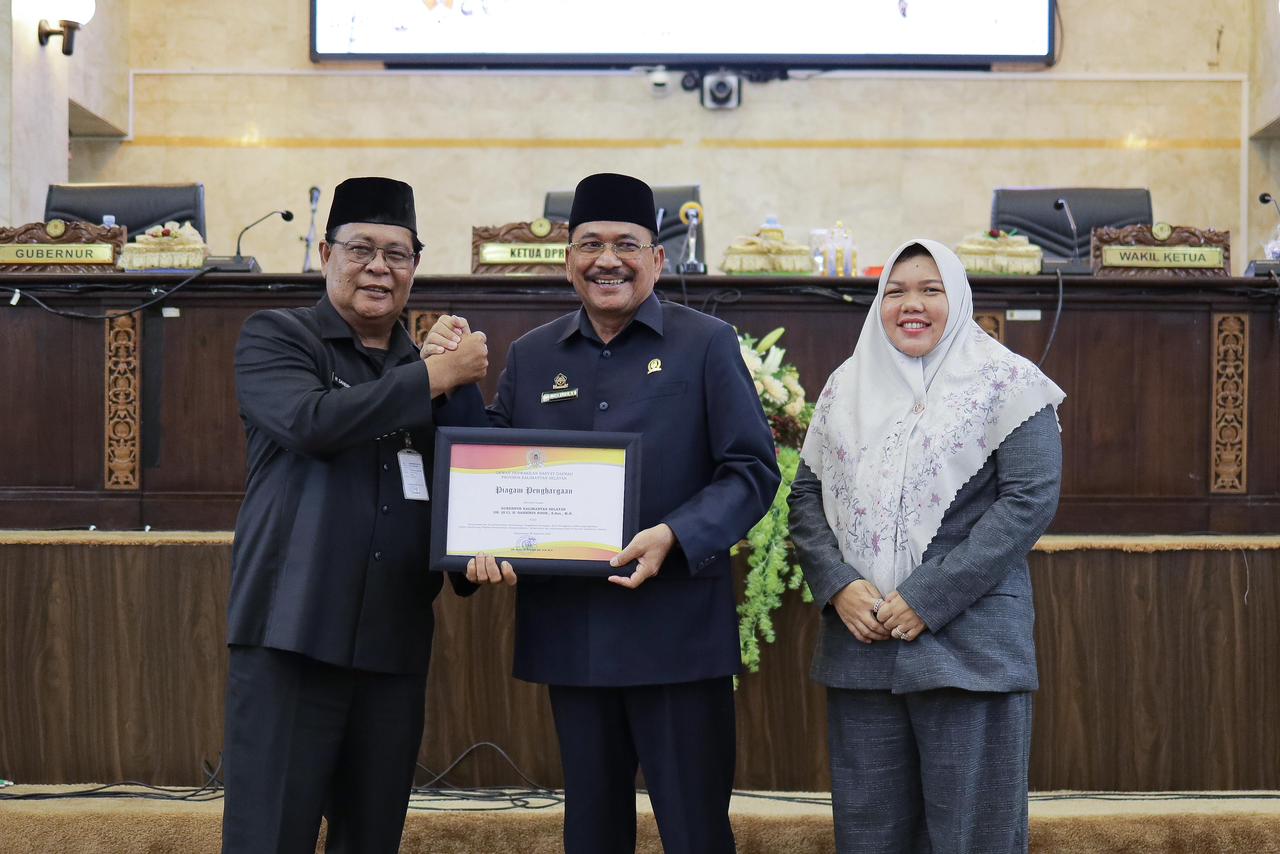 BANJARMASIN – Gubernur Provinsi Kalimantan Selatan (Kalsel) H. Sahbirin Noor bersama Pimpinan DPRD Kalsel menandatangani Raperda APBD Provinsi Kalsel 2024 di ruang rapat paripurna DPRD Kalsel, Kamis (16/11/2023). APBD Kalsel 2024 yang disetujui oleh DPRD Kalsel mencapai Rp10,4 triliun. Persetujuan ini disampaikan Pimpinan DPRD Kalsel kepada forum dalam rapat paripurna dengan agenda Persetujuan Raperda APBD 2024 Menjadi Perda.