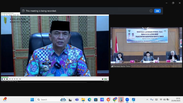 TAMIANG LAYANG – Pemerintah Kabupaten Barito Timur mengikuti Verifikasi Lapangan Hybrid Kabupaten/Kota Layak Anak (KLA) Tahun 2025 yang digelar Kementerian Pemberdayaan Perempuan dan Perlindungan Anak (Kemen PPPA) RI secara daring, Jumat (25/4/2025).